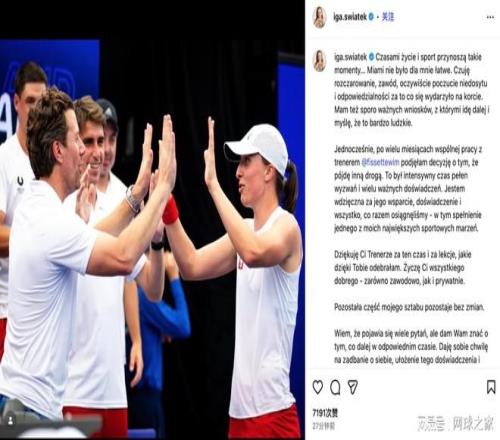 今晚,斯瓦泰克無預(yù)警官宣結(jié)束與教練費(fèi)塞特的合作,在聲明中寫道:“有時(shí)候,人生和體育總會(huì)帶來這樣的時(shí)刻……邁阿密這站比賽對(duì)我而言充滿挑戰(zhàn)。我當(dāng)然感到失望、苦澀,也為自己在場(chǎng)上的表現(xiàn)承擔(dān)責(zé)任。與此同時(shí),我也學(xué)到了許多重要的一課,我認(rèn)為這是人之常情。話雖如此,在與我的教練維姆·費(fèi)塞特共事數(shù)月之后,我決定選擇一條不同的道路。那段時(shí)光緊張而充實(shí),充滿挑戰(zhàn),也收獲了許多寶貴的經(jīng)歷。我感謝他的支持、他的經(jīng)驗(yàn),以及我們共同取得的一切成就——其中包括我在體育生涯中最大的夢(mèng)想之一?!?/p>