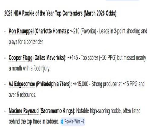 但在新秀賠率榜上,黃蜂隊(duì)的克努佩爾-210第一,弗拉格+145第二,埃奇庫姆+15000第三,換言之克努佩爾是最佳新秀的斷崖第一。