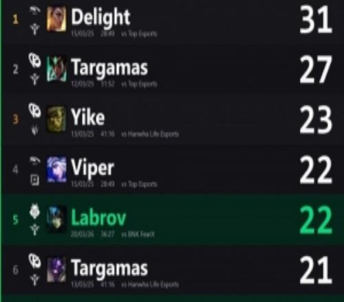 電競(jìng)體育3月25報(bào)道 外媒統(tǒng)計(jì)數(shù)據(jù),先鋒賽歷史輔助選手單場(chǎng)比賽助攻數(shù)排行:Delight 31個(gè)第一。