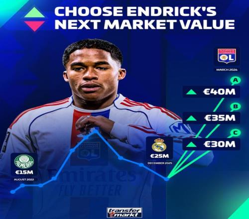 德轉(zhuǎn)預(yù)熱恩德里克身價(jià)上漲:最低漲至3000萬歐,最高4000萬歐