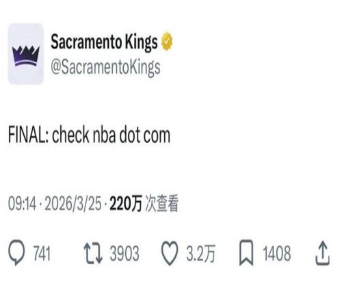 但是本場被黃蜂打爆后,國王官方只在社媒上這么寫道:最終結(jié)果請見NBA官網(wǎng)。