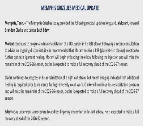 灰熊官方宣布:莫蘭特因左肘尺側(cè)副韌帶(UCL)扭傷提前結(jié)束本賽季征程,預(yù)計(jì)26-27賽季開始前完成康復(fù)......
