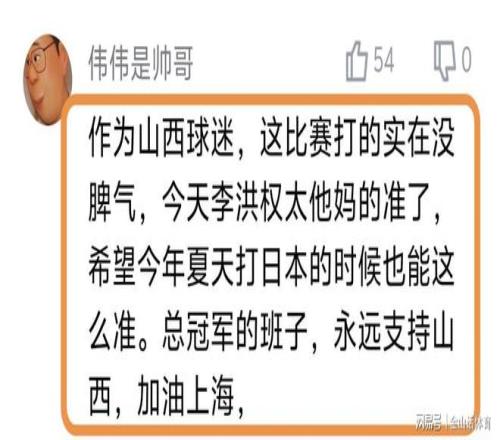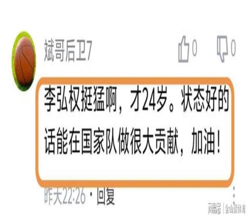 李弘權(quán)出色的表現(xiàn),也讓球迷們是喜出望外,賽后紛紛在網(wǎng)絡(luò)平臺留言?!白鳛樯轿髑蛎?,這比賽打的實在沒脾氣,今天李洪權(quán)太準(zhǔn)了,希望今年夏天打日本的時候也能這么準(zhǔn)。總冠軍的班子,永遠(yuǎn)支持山西,加油上海,”;“李弘權(quán)挺猛啊,才24歲。狀態(tài)好的話能在國家隊做很大貢獻(xiàn),加油!”;“真心話,就這國家隊以前都不帶李弘權(quán)。希望今年世預(yù)賽也能進(jìn)入國家隊,也能這么準(zhǔn),好好收拾小本子?!薄?/p>