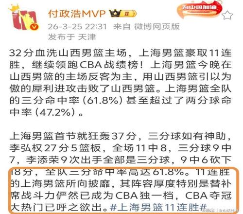 賽后,媒體人付政浩MVP在社媒發(fā)文:32分血洗山西男籃主場,上海男籃豪取11連勝,繼續(xù)領(lǐng)跑CBA戰(zhàn)績榜!上海男籃今晚在山西男籃的主場反客為主,用山西男籃引以為傲的犀利進攻擊敗了山西男籃。上海男籃全隊的三分命中率(61.8%)甚至超過了兩分球命中率(47.2%)……11連勝的上海男籃所向披靡,其陣容厚度特別是替補席戰(zhàn)斗力儼然已成為CBA獨一檔,CBA奪冠大熱門已呼之欲出。