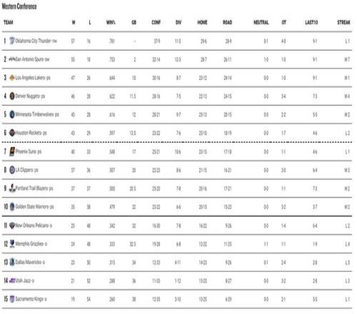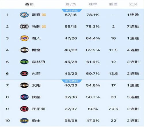 最新的排名:1-3:雷霆、馬刺、湖人;(前二已經(jīng)鎖定季后賽)