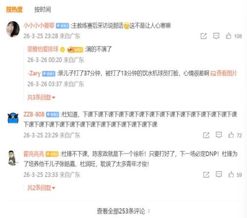 可能很多球迷不知道,胡明軒和張皓嘉是杜鋒經(jīng)紀(jì)公司旗下的球員,還有杜潤旺也是。所以不管胡明軒、張皓嘉、杜潤旺表現(xiàn)多差,還是有充足的上場時間。賽后,廣東宏遠(yuǎn)官方賬號被球迷攻陷了,很多球迷留言杜鋒下課。