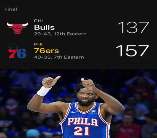 常規(guī)賽,76人主場157-137大勝公牛。