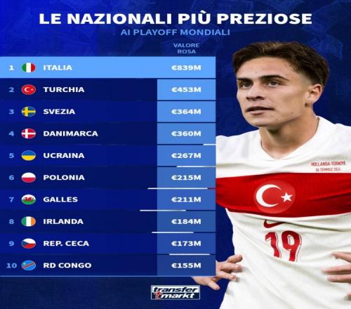德轉(zhuǎn)盤點(diǎn)世預(yù)賽附加賽各隊(duì)身價(jià):意大利8.39億歐元斷層領(lǐng)先
