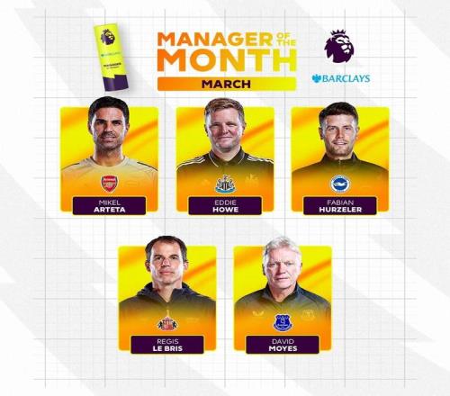 3月26日,英超官方公布了3月份最佳主教練候選名單,阿爾特塔領(lǐng)銜,埃迪-豪、莫耶斯、許爾策勒、勒布里斯在列。