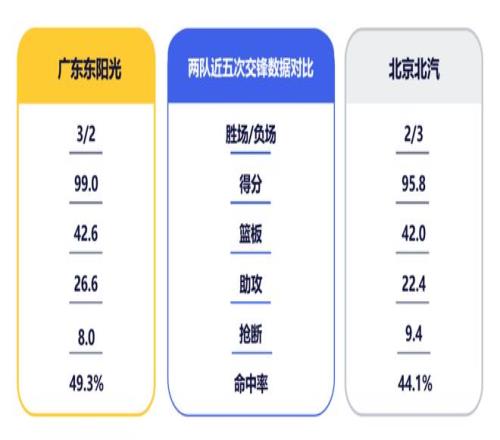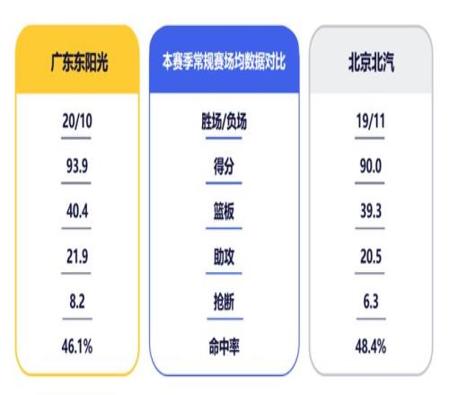 北京隊進攻效率排在聯(lián)盟第二,三分命中率更高居聯(lián)盟之首,有8人場均得分上雙,廣東隊此戰(zhàn)在防守端又將迎來考驗。北京隊后場雙星近期狀態(tài)火熱,趙睿在與遼寧一戰(zhàn)中獨得34分,并與麥基形成良好的化學反應,近三場比賽助攻數(shù)逐漸走高。而首回合缺陣的陳盈駿近五場比賽三分命中率均突破40%。此役,廣東隊后場如何做出應對,將是一大看點。