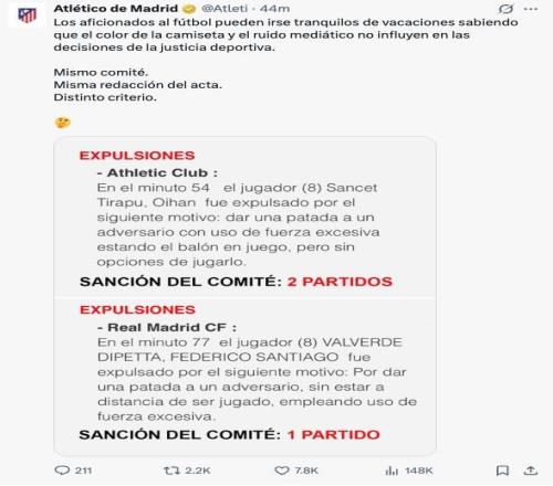 西班牙足協(xié)紀(jì)律委員會(huì)最終維持裁判比賽報(bào)告內(nèi)容,對皇馬中場巴爾韋德禁賽一場。馬競官方社媒表示:“恭喜,你們在這方面是最棒的,目標(biāo)達(dá)成:罰巴爾韋德停賽1場。”