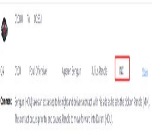 第五次發(fā)生在距離加時(shí)賽結(jié)束還有33.6秒,蘭德?tīng)栐谄鹛鵂?zhēng)搶籃板時(shí),用手按住了泰特的肩膀,這一接觸限制了泰特去爭(zhēng)搶籃板的能力。這是一次漏吹的犯規(guī),火箭吃虧,森林狼獲利。