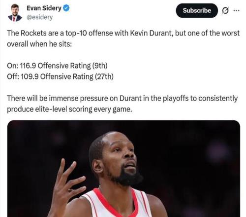 開賽至今,火箭進(jìn)攻一直極度依賴杜蘭特,當(dāng)他在場(chǎng)時(shí)火箭進(jìn)攻效率聯(lián)盟第九,下場(chǎng)時(shí)進(jìn)攻效率僅排27名。