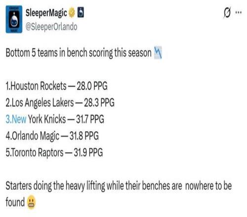 之所以進(jìn)攻如此依賴KD,替補(bǔ)糟糕的表現(xiàn)是重要原因,火箭隊(duì)本賽季替補(bǔ)得分聯(lián)盟倒數(shù)第一,甚至不如陣容深度捉襟見肘的湖人隊(duì)。