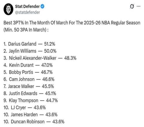 杜蘭特幾乎是唯一穩(wěn)定可靠的三分終結(jié)點(diǎn),3月份至今他投出47%的三分命中率,高居同期聯(lián)盟第四。