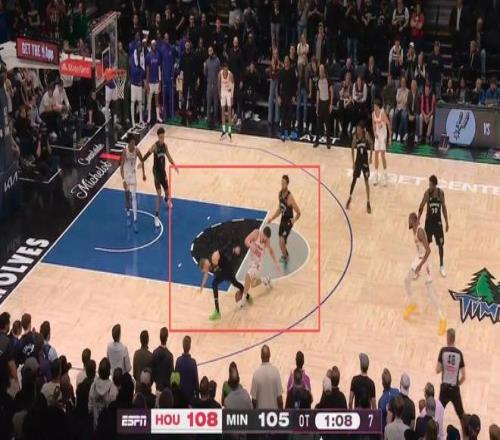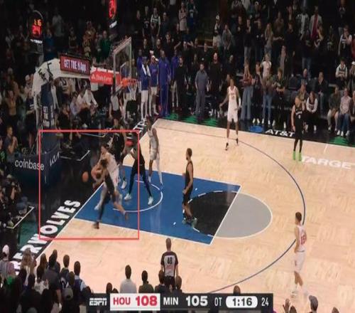 申京爭搶球過程中出界,裁判錯(cuò)判森林狼出界,火箭隊(duì)獲得球權(quán)——火箭獲利