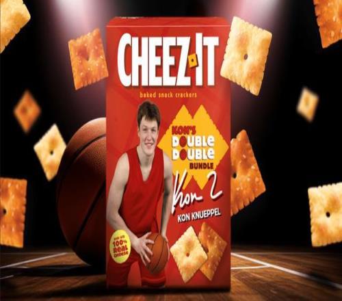 近日,這位杜克大學出品的球星與知名零食品牌Cheez-It聯(lián)手,推出了名為“Kon的雙雙Cheez-It禮包”(Kon’s Double Double Cheez-It Bundle)。這個定價20美元的盒子,巧妙地玩了一個“雙關語”梗:既是指他作為全能球員在場上拿“兩雙”的統(tǒng)計數據,也代表盒子里裝了兩款他最愛的口味——白切達干酪味和特制焦香味。