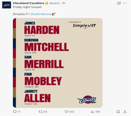 騎士:米切爾10中1拿6分6助攻,哈登17分14助攻5籃板,莫布利23分10籃板,阿倫18分10籃板,梅里爾10分4助攻,斯特魯斯29分8籃板8三分,埃利斯10分,托布11分。