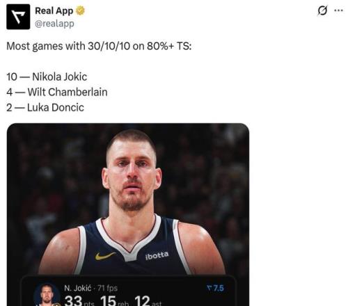 同時本場比賽也是約基奇生涯第10次以至少80%真實命中率砍下30+三雙,NBA歷史斷檔第一,張伯倫4次排在第二,東契奇2次排在第三。