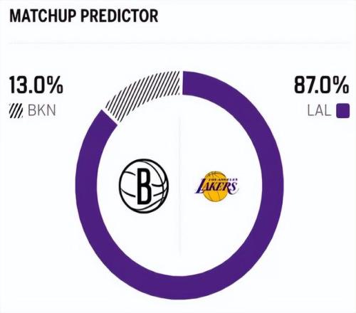 賽前,美媒ESPN對本場比賽進行了勝率預測,湖人隊勝率高達87.0% ,籃網(wǎng)勝率則僅有13.0%,差距有點大 。