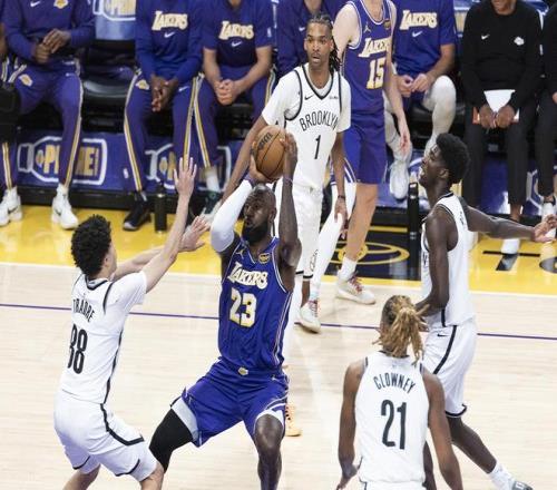 第二節(jié)雙方輪換陣容階段,籃網(wǎng)上來一波小高潮追到只差1分,湖人暫停。但暫停以后,籃網(wǎng)內(nèi)外開花領先到5分,詹姆斯助攻布朗尼三分命中止血,然后自己造犯規(guī)兩罰兩中。東契奇三分命中湖人重新領先,然后拋投再進領先到了7分。但特拉奧雷突然爆發(fā),連得4分幫助籃網(wǎng)緊緊咬住比分,半場結束之前他又命中壓哨三分,湖人61-59只領先2分。