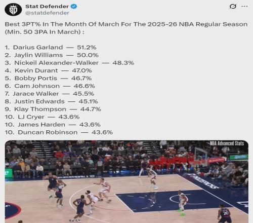 進(jìn)入3月份以來(lái),NBA三分最準(zhǔn)的球員是誰(shuí)?估計(jì)很多人都猜不到,快船后衛(wèi)加蘭的三分命中率領(lǐng)跑全聯(lián)盟。3月份三分命中率排行榜(至少出手50次):1、加蘭51.2%;2、杰林-威廉姆斯50%;3、亞歷山大-沃克48.3%。