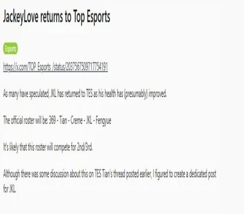 體育播報(bào)3月28日宣 近日,TES戰(zhàn)隊(duì)官宣Jackeylove的回歸和Tian的加入,在外網(wǎng)引起熱議;