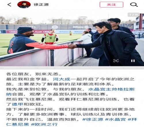 體育播報3月28日宣 今日,前蓉城主帥徐正源更新社媒,曬出了自己前往拜仁、水晶宮等隊考察的近況。他寫道: