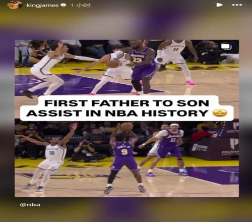 在本場比賽中,詹姆斯助攻布朗尼投進(jìn)三分,這記助攻是NBA歷史首次父親給兒子的助攻!