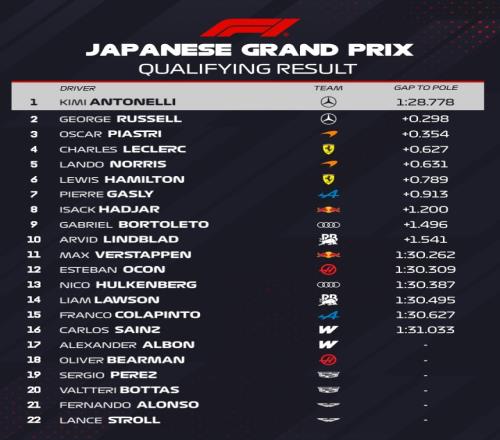 F1日本站排位賽:安東內(nèi)利背靠背拿下桿位!拉塞爾第2勒克萊爾第4