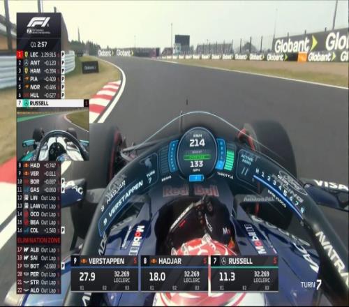 Q2最后一個飛馳圈,安東內(nèi)利刷出了1:29.048的成績拿回第一的位置,維斯塔潘則被擠出了前10。Q2停表,塞恩斯、科拉平托、勞森、霍肯伯格、奧康和維斯塔潘6人被淘汰。