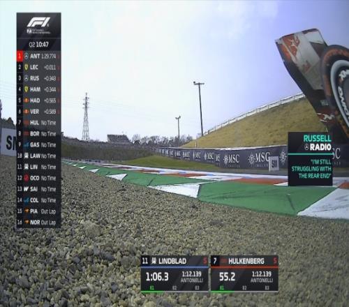 Q2安東內(nèi)利第一個開始做飛馳圈,跑出1:29.774的成績,他的隊友拉塞爾第二,但拉塞爾很快就被勒克萊爾超越,拉塞爾在無線電中反饋車尾仍有問題。