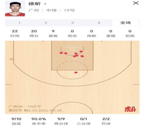 徐昕全場10投9中,高效砍下20分、9籃板(含4個前場籃板),外加2次封蓋,正負(fù)值高達(dá)+29,為全隊(duì)最高。他的進(jìn)攻幾乎全部來自籃下,三分線外1投未中,卻憑借精準(zhǔn)的接球順下與補(bǔ)籃能力,將每一次觸球轉(zhuǎn)化為致命威脅。遼寧隊(duì)的內(nèi)線防守體系在他面前形同虛設(shè)——只要他落位禁區(qū),對方必被迫雙人包夾,從而為外線隊(duì)友撕開巨大空檔。這種“牽一發(fā)而動全身”的戰(zhàn)術(shù)價值,遠(yuǎn)超數(shù)據(jù)本身。