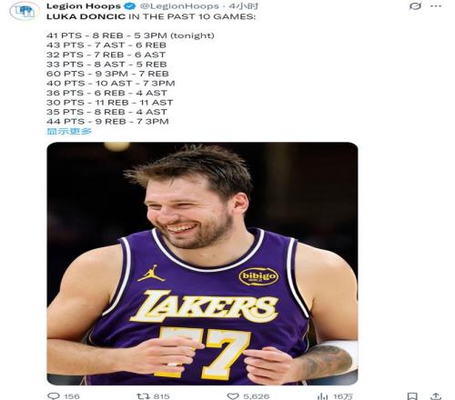 東契奇今天又炸了。25投15中,三分10中5,41分8籃板3助攻3搶斷。湖人116-99輕取籃網(wǎng),最近12場(chǎng)贏了11場(chǎng)。他連續(xù)12場(chǎng)30+,隊(duì)史第四,跟貝勒、韋斯特、科比坐一桌。