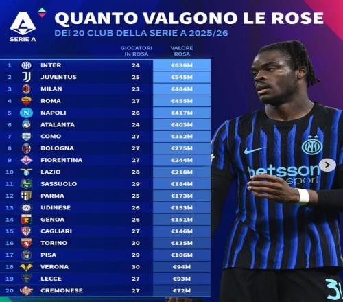 意甲20隊(duì)德轉(zhuǎn)身價(jià)榜:國(guó)米6.36億第1,尤文5.45億第2,米蘭第3