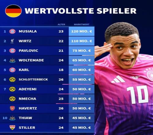 北京時(shí)間3月29日,在完成了歐洲五大聯(lián)賽球員的身價(jià)更新之后,德轉(zhuǎn)列出了德國(guó)球員身價(jià)前10,穆西亞拉1.2億歐元第一,維爾茨1.1億歐元第二。