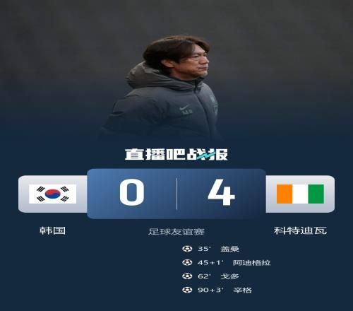 洪明甫率領(lǐng)的韓國隊(duì)在2026年的首場國際比賽中慘敗于非洲勁旅科特迪瓦。