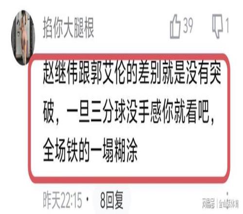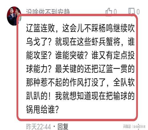 遼寧隊4大主力糟糕的表現(xiàn),賽后也被球迷們紛紛吐槽?!斑|寧一群人真像一群無頭蒼蠅?!保弧摆w繼偉跟郭艾倫的差別就是沒有突破,一旦三分球沒手感你就看吧,全場鐵的一塌糊涂”;“三個后衛(wèi)總共20中3,打毛線,一人一球”;“遼籃連敗,這會兒不踩楊鳴繼續(xù)吹烏戈了?就現(xiàn)在這些蝦兵蟹將,誰能攻堅?誰能突破?誰又有定點投球能力?最關(guān)鍵的還把遼籃一貫的那種惹不起的作風(fēng)打沒了,全隊軟趴趴的!我就想知道現(xiàn)在把輸球的鍋甩給誰?”;“遼寧解散吧,可別丟人了,一盤散沙”……