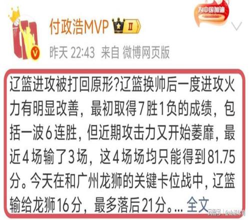 賽后,媒體人付政浩發(fā)文表示:遼籃進(jìn)攻被打回原形?遼籃換帥后一度進(jìn)攻火力有明顯改善,最初取得7勝1負(fù)的成績,包括一波6連勝,但近期攻擊力又開始萎靡,最近4場輸了3場,這4場場均只能得到81.75分。今天在和廣州龍獅的關(guān)鍵卡位戰(zhàn)中,遼籃輸給龍獅16分,最多落后21分。遼籃本場輸龍獅和上一場輸吉林男籃如出一轍,內(nèi)外線對位都處于劣勢,有些招架不住、力不從心……