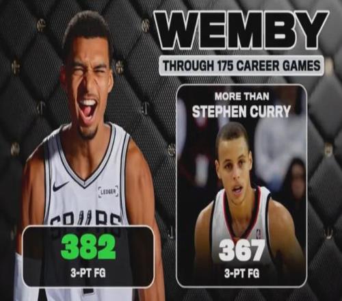 在三分球命中數(shù)方面,文班亞馬以382個超越了庫里的367個。