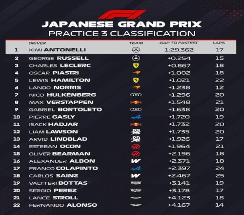 2026賽季F1日本大獎賽第三次練習(xí)賽結(jié)束,梅奔車手安東內(nèi)利和拉塞爾包攬前二,勒克萊爾第三,但與梅奔兩強(qiáng)有0.8秒以上的差距。麥克拉倫雙雄皮亞斯特里、諾里斯分列第四和第六名。漢密爾頓第五,并且成為前十名車手中完成圈數(shù)最多的車手。維斯塔潘第八,奧迪車隊(duì)兩位車手霍肯博格和博托萊托均進(jìn)入前十,分別獲得第七和第九名。