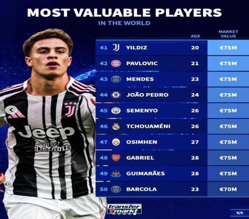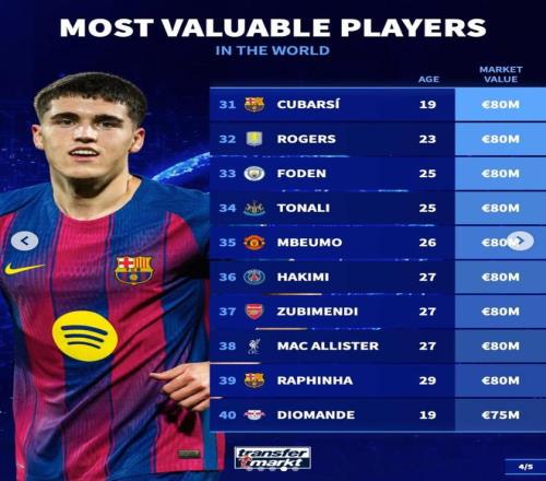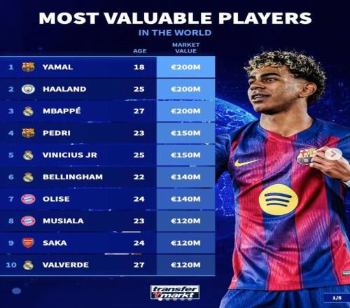 北京時(shí)間3月29日,在更新了歐洲五大聯(lián)賽球員的身價(jià)之后,德轉(zhuǎn)列出了目前身價(jià)足壇身價(jià)排名前50的球員,亞馬爾、哈蘭德、姆巴佩2億歐元領(lǐng)銜,共有20名球員身價(jià)過億。