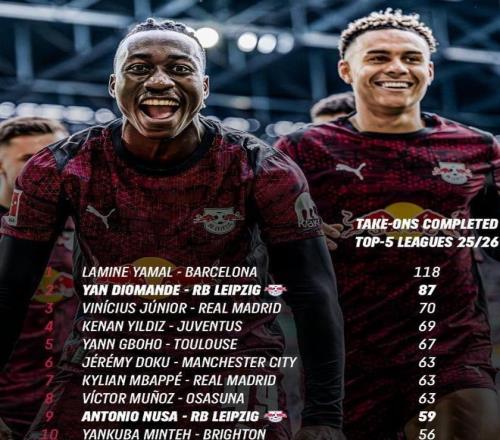 本賽季至今,揚(yáng)迪奧曼德代表RB萊比錫出戰(zhàn)各項(xiàng)賽事29場(chǎng),交出了11球7助攻的亮眼成績(jī)單。而真正讓整個(gè)歐洲為之側(cè)目的,是他令人嘆為觀止的突破能力。到目前為止,揚(yáng)迪奧曼德的過(guò)人數(shù)據(jù)僅次于亞馬爾,是德甲賽場(chǎng)實(shí)至名歸的過(guò)人王。在本賽季五大聯(lián)賽成功過(guò)人次數(shù)榜單上,揚(yáng)迪奧曼德以87次成功過(guò)人高居第二,僅次于巴薩天才亞馬爾的108次。但別忘了,亞馬爾早已是公認(rèn)的頂級(jí)天賦,而這位萊比錫邊鋒,一年半前還在美國(guó)半職業(yè)聯(lián)賽掙扎。