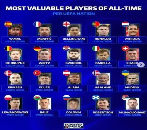 而在歐洲各家國家隊球員歷史身價排行榜中,西班牙國家隊、法國、挪威均是2026年度身價2億球員領跑,英格蘭身價最高的貝林厄姆,他目前身價為1.8億歐,葡萄牙則是2014年時期的C羅,當時他的身價為1.2億歐。此外,荷蘭的范戴克在2019年以1億歐領跑,比利時則以2018年時身價高達1.5億歐德布勞內(nèi)領銜,德國隊歷史最高身價則是由2024年的維爾茨保持,當時他的身價高達1.4億歐,丹麥的記錄則由埃里克森保持,當時他的身價為1億歐。值得關注的是,除了上述國家隊外,其他國家隊歷史最高身價均未超過1億歐。