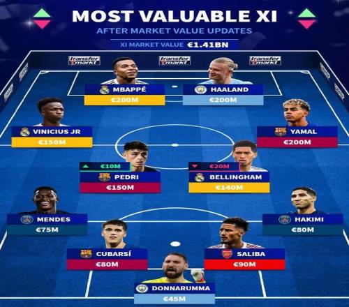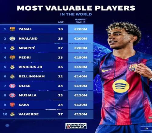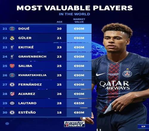 其中西甲聯(lián)賽球員中,身價最高的為亞馬爾、姆巴佩,他們的身價均為2億歐,英超聯(lián)賽身價最高的球員則是哈蘭德,他目前的身價也是2億歐,德甲聯(lián)賽身價最高的球員為目前效力于拜仁的奧利塞,他的身價為1.4億歐,法甲聯(lián)賽身價最高的是效力于巴黎的內(nèi)維斯,他目前身價為1.1億歐。意甲方面,身價最高的是來自國米的勞塔羅,他目前身價為8500萬歐,排在這份榜單第29的位置。