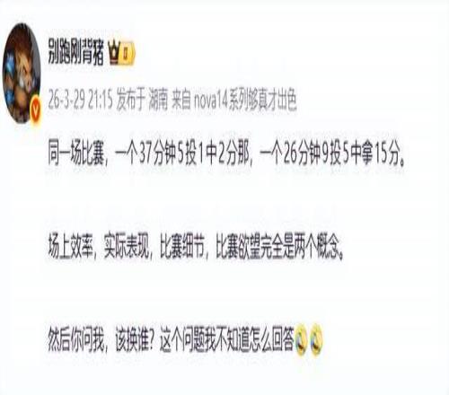 然而,廣東媒體人“別跑剛背豬”在社交平臺公開質(zhì)疑:“同一場比賽,一個(gè)37分鐘5投1中2分那,一個(gè)26分鐘9投5中拿15分。場上效率,實(shí)際表現(xiàn),比賽細(xì)節(jié),比賽欲望完全是兩個(gè)概念。然后你問我,該換誰?這個(gè)問題我不知道怎么回答。”這一質(zhì)問直指教練組用人邏輯。表面上看,陳家政的效率數(shù)據(jù)碾壓張皓嘉;但若僅以得分論英雄,將忽略籃球運(yùn)動中“非數(shù)據(jù)貢獻(xiàn)”的真實(shí)價(jià)值——如防守壓迫、掩護(hù)質(zhì)量、輪轉(zhuǎn)速度與精神屬性。