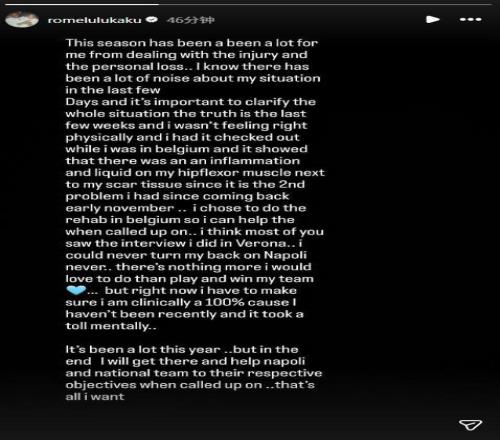 早些時候,盧卡庫因為在受傷退出比利時大名單但沒有按照約定返回那不勒斯遭遇批評,北京時間3月30日,他在社交媒體上發(fā)表動態(tài),解釋了自己的做法。