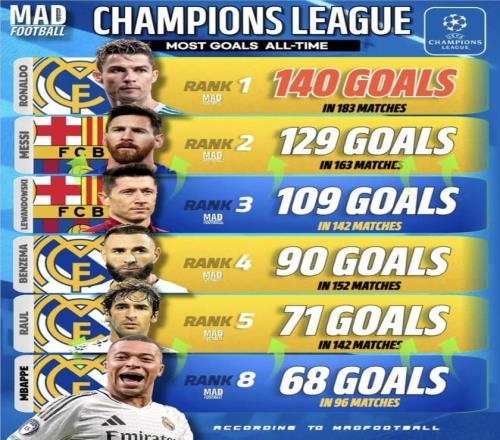 歐冠射手榜排名(部分)
