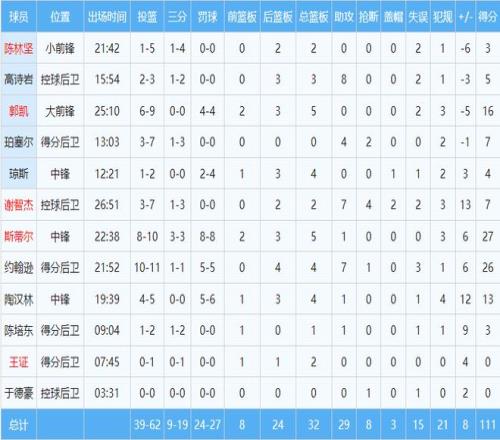 本場(chǎng)比賽,山東隊(duì)共4人得分上雙,斯蒂爾10投8中,其中三分球3投全中,斬獲27分5籃板。約翰遜不遑多讓?zhuān)?1投10中,貢獻(xiàn)26分4籃板7助攻。國(guó)內(nèi)雙塔陶漢林和郭凱同樣表現(xiàn)不俗,陶漢林13分4籃板,郭凱16分5籃板。