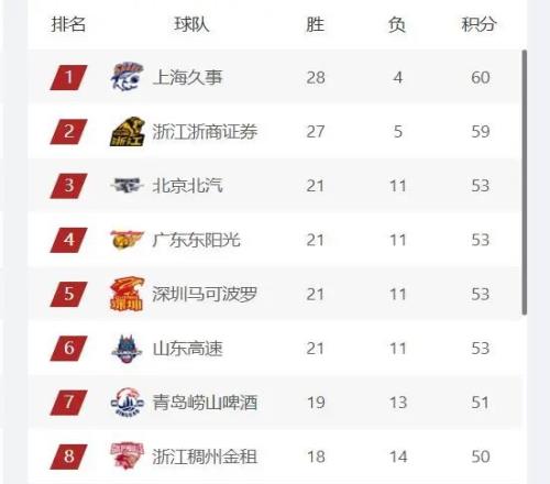 CBA最新排名,上海第1,廣廈第2,4支球隊(duì)競爭常規(guī)賽前四